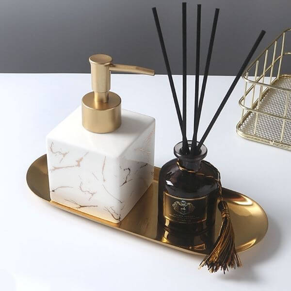 A complete set of 2 colors dispenser with trendy looking, golden serve tray is included